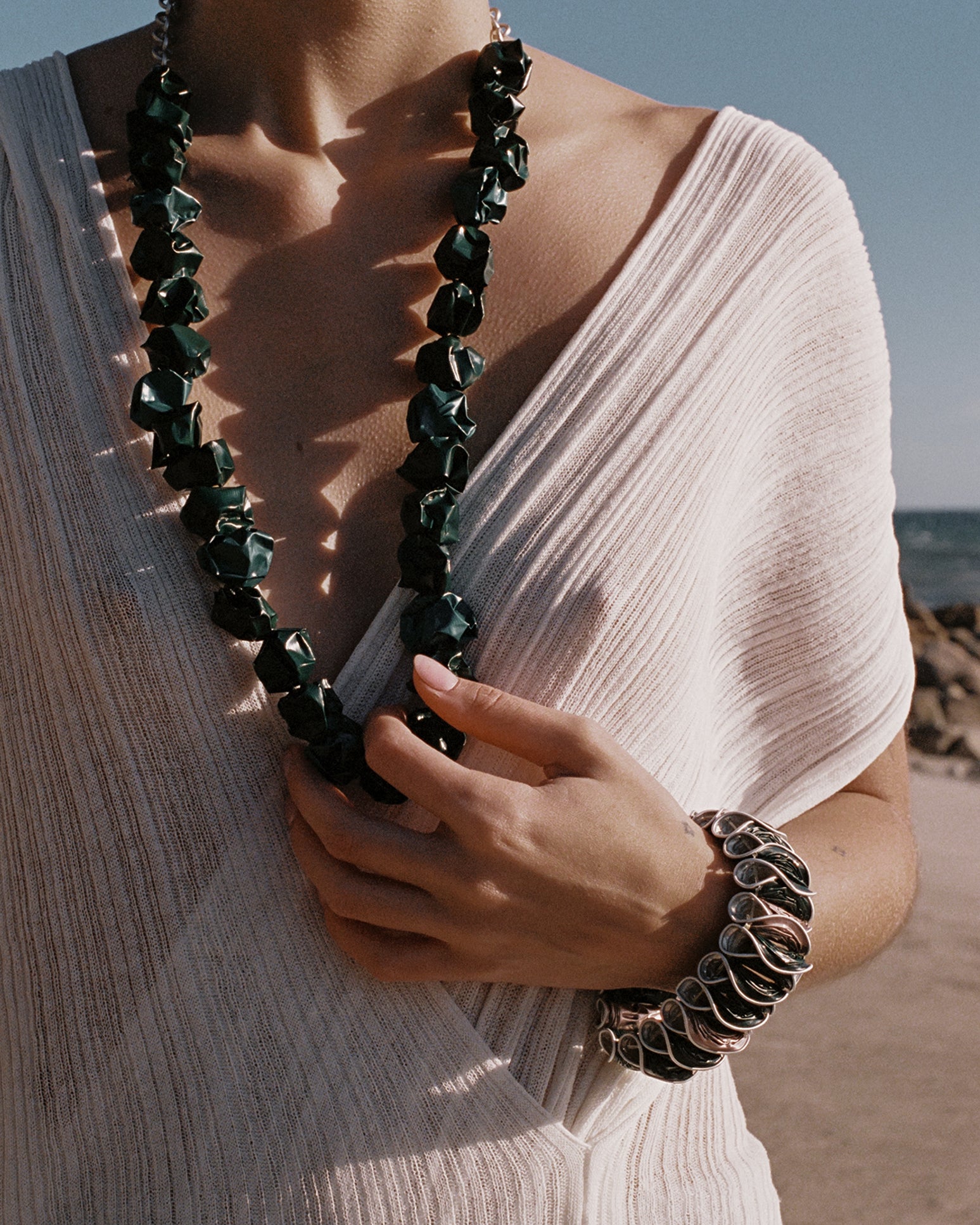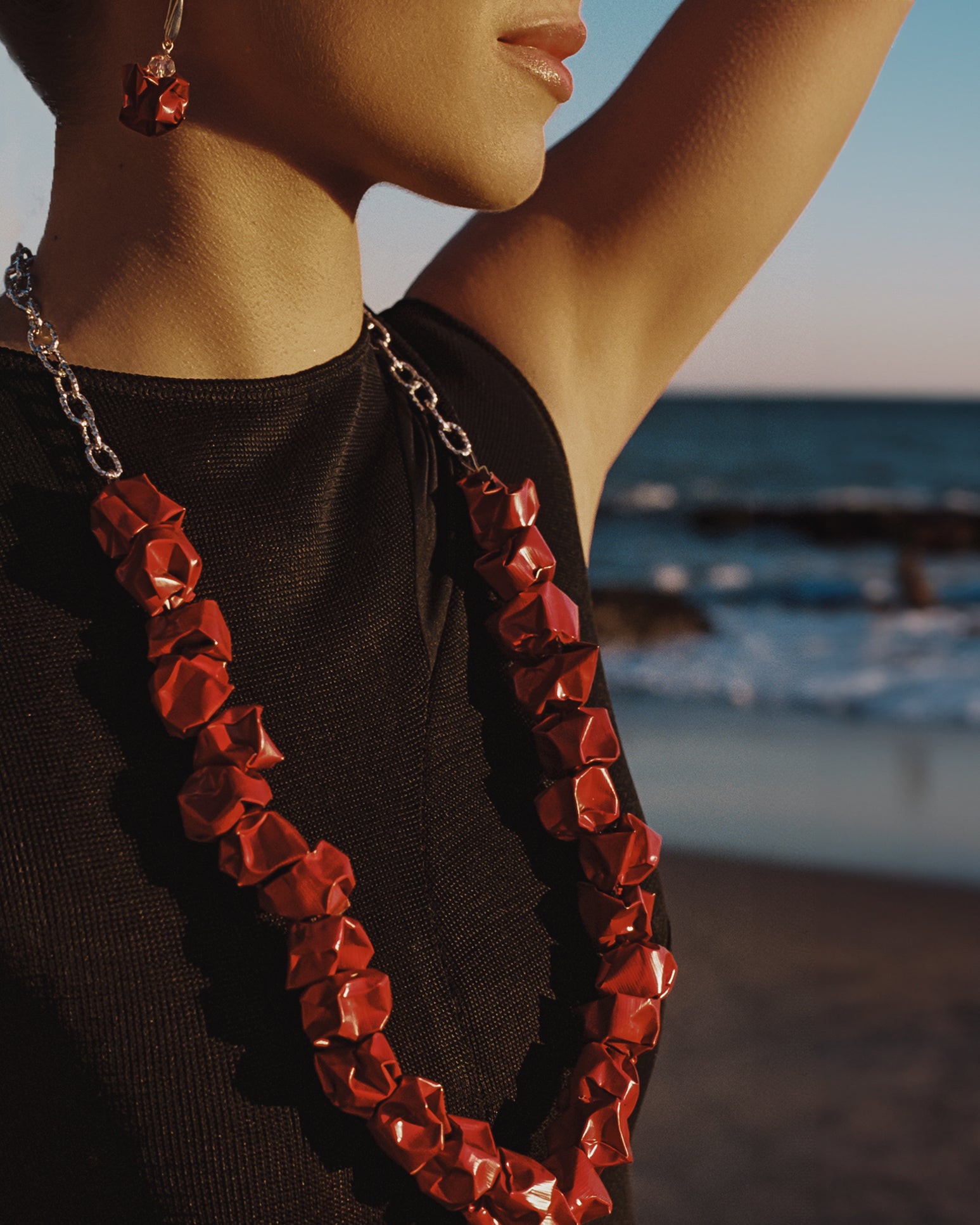 A triumph of color that transforms the ordinary into an extraordinary statement piece. Carefully crafted from intricately rolled and molded coffee pods, this necklace takes on the shape of vibrant rocks, creating a substantial yet lightweight masterpiece.
